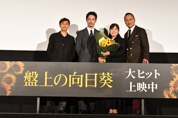 坂口健太郎と渡辺謙が魂の演技でぶつかり合う、柚月裕子原作のヒューマンミステリー『盤上の向日葵』がついに公開を迎えた。10月31日に行われた初日舞台挨拶には、主演の坂口健太郎、共演の渡辺謙、そして脚本・監督の熊澤尚人が登壇。さらに、原作者の柚月裕子も駆けつけ、熱い想いが交錯する感動のイベントとなった。