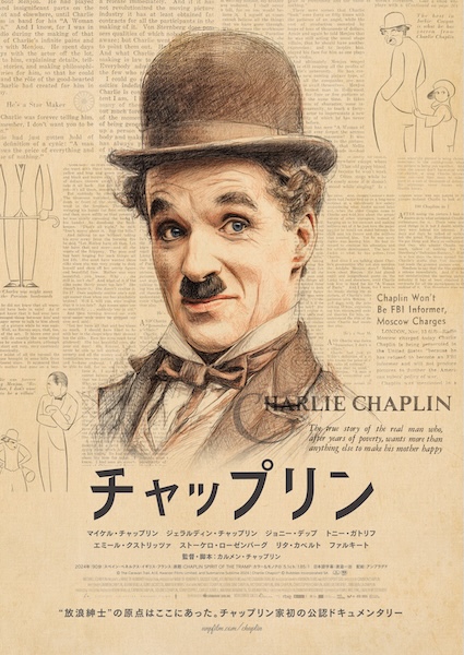 あわせて、放浪紳士に扮するチャップリンを、イラストタッチでレトロに表現したアザービジュアルが解禁。眉をクイッと上げた表情と、当時の新聞を背景にしたデザインが、喜劇王の波乱に満ちた人生を象徴的に映し出している。