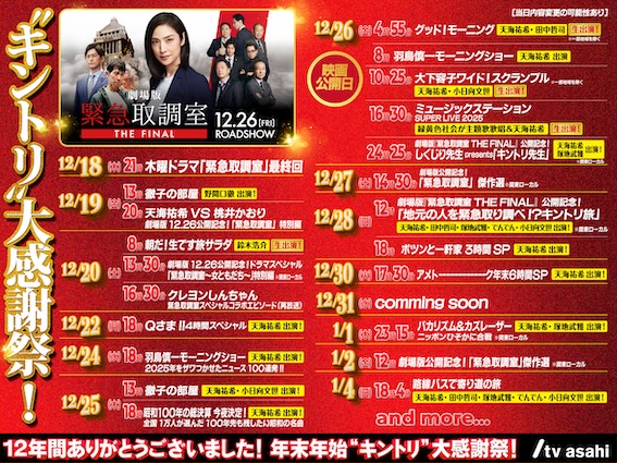 さらに、年末年始“キントリ”大感謝祭の開催も発表された。ドラマ最終回の放送を皮切りに、情報番組やバラエティ番組への出演、公開初日の電波ジャック、公開記念特番「キントリ旅」など、天海祐希をはじめとする豪華キャスト陣が連日メディアに登場。12年分の感謝を込めた一大プロジェクトとして、公開を大きく盛り上げる。